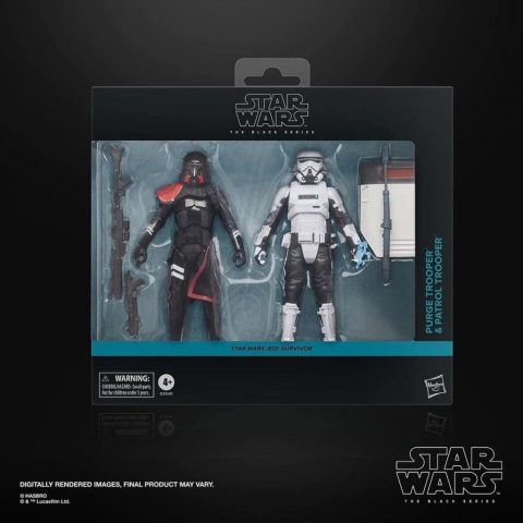 En la línea The Black Series (6 pulgadas), una de las piezas más esperadas es Boba Fett (The Book of Boba Fett), que llega con una articulación mejorada y una capa de tela real, ofreciendo un nivel de detalle superior al de versiones previas del personaje. Además, se presentó un paquete doble con el Purge Trooper y el Patrol Trooper, dos figuras imperiales que complementan la colección con un enfoque en la estética militar del Imperio.